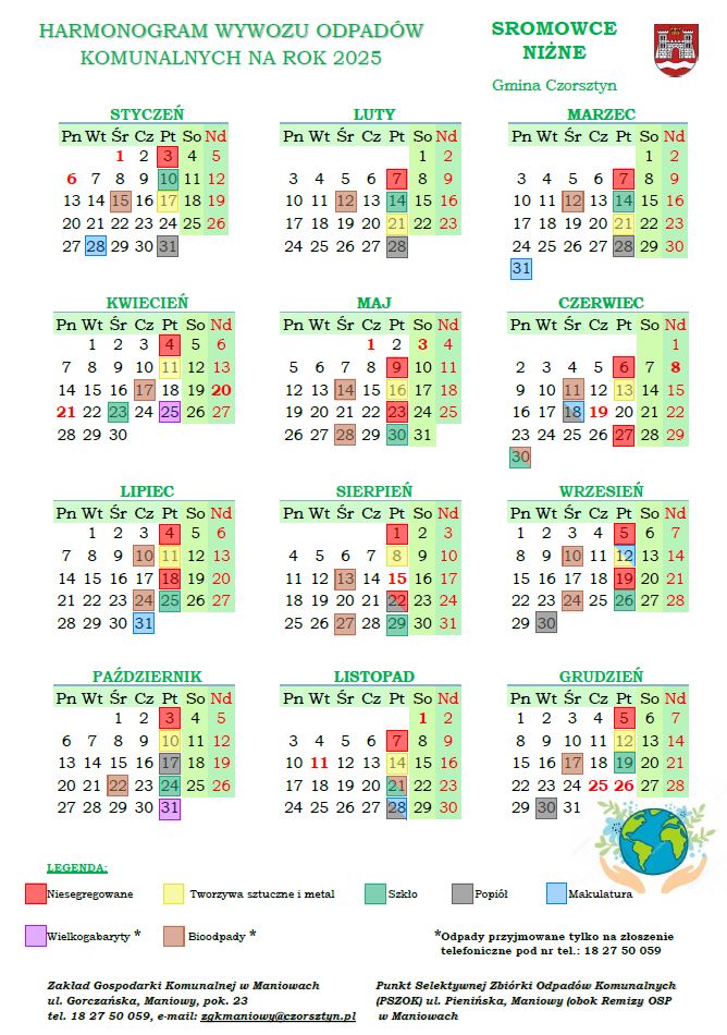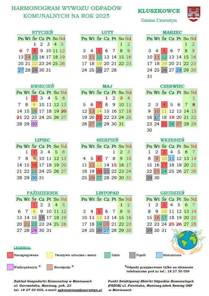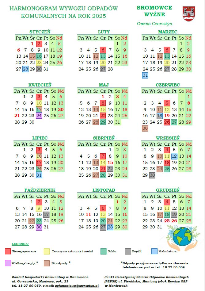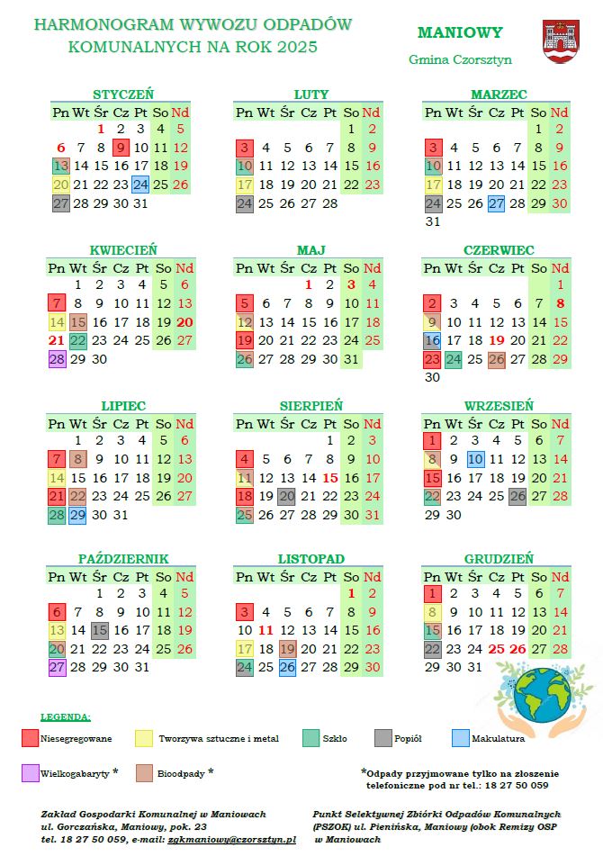 Kalendarz przygotowano dla każdego sołectwa na terenie gminy i jest on dostępny na stronie Urzędu Gminy Czorsztyn w zakładce: Samorząd/Środowisko/ Harmonogram wywozu odpadów.