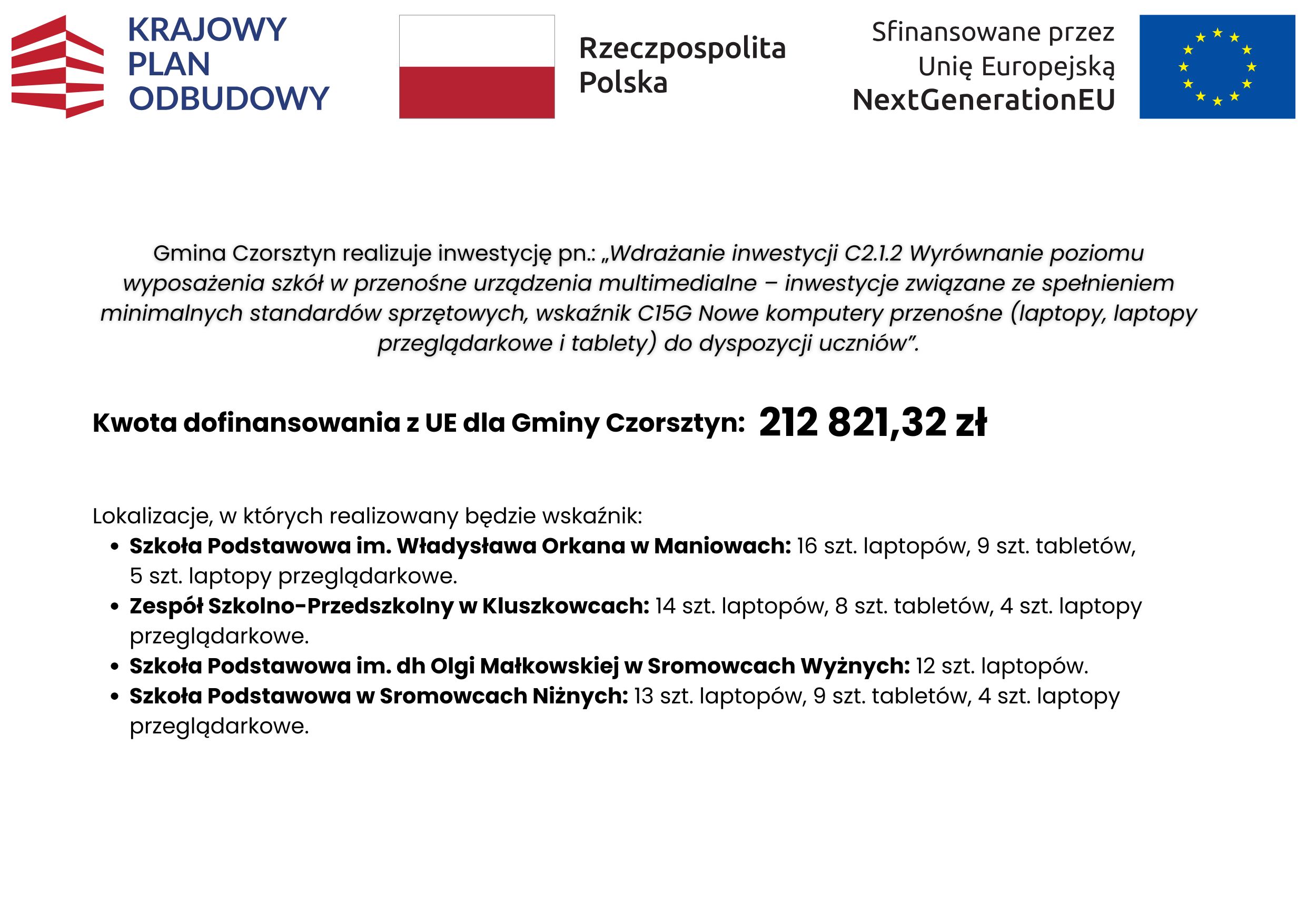 Gmina Czorsztyn realizuje inwestycję pn. „Wdrażanie inwestycji C2.1.2 Wyrównanie poziomu wyposażenia szkół w przenośne urządzenia multimedialne – inwestycje związane ze spełnieniem minimalnych standardów sprzętowych, wskaźnik C15G Nowe komputery przenośne (laptopy, laptopy przeglądarkowe i tablety) do dyspozycji uczniów”, realizowaną w ramach Krajowego Planu Odbudowy i Zwiększania Odporności (KPO).