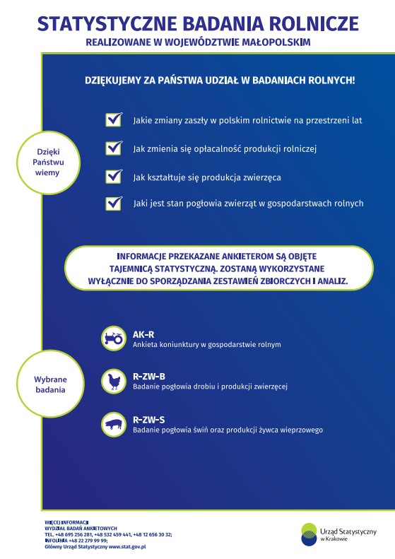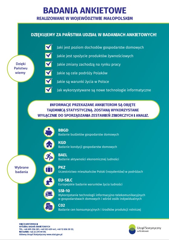 Wszystkie badania realizowane są głównie metodą wywiadu telefonicznego przez pracowników Urzędu Statystycznego (ankieterów i teleankieterów statystycznych) w gospodarstwach domowych, gospodarstwach rolnych, punktach usługowych, targowiskach oraz na przejściach granicznych na terenie województwa małopolskiego. Każdy z ankieterów posiada legitymację wydaną przez Dyrektora Urzędu Statystycznego w Krakowie. W załączeniu znajduje się wykaz badań ankietowych realizowanych w 2022 r. przez statystykę publiczną oraz wzór legitymacji ankietera.