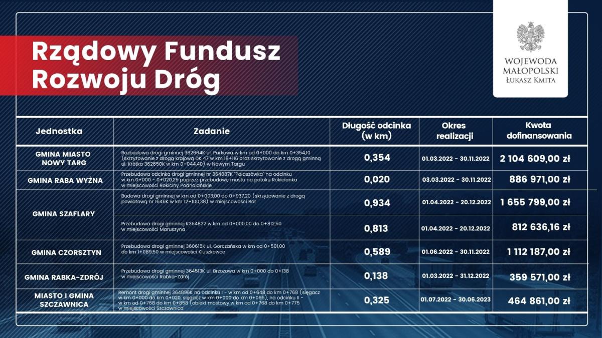 – Przekazane wsparcie jest przykładem na to, że razem jesteśmy silniejsi. Dzięki przykładnej współpracy administracji rządowej z samorządową Małopolanom będzie żyło się lepiej – dodaje wojewoda małopolski Łukasz Kmita.
