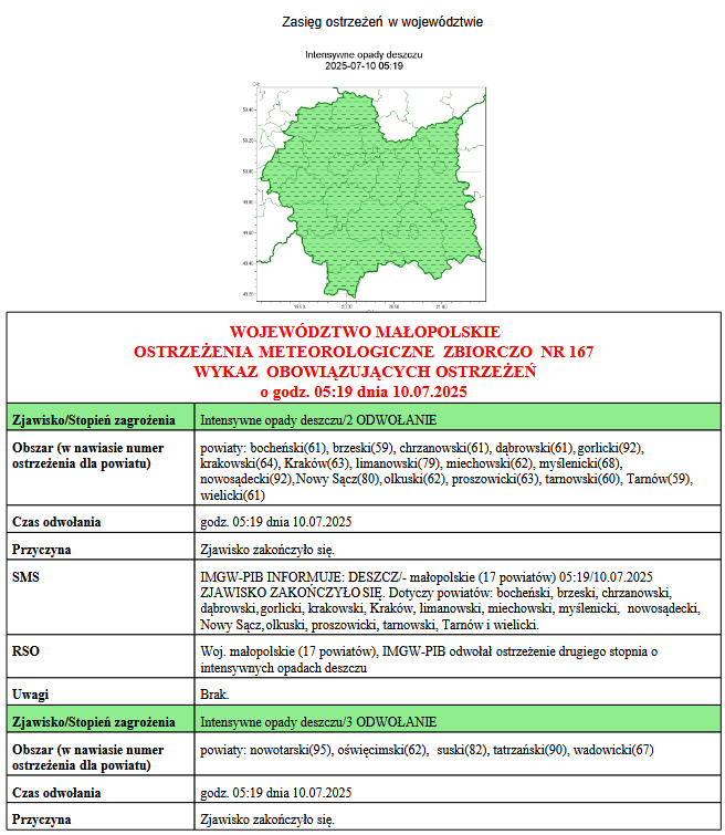 Ostrzeżenie meteorologiczne 167 - ODWOŁANIE 10.07.2025 12:27 Treść Ostrzeżenie meteorologiczne 167 - ODWOŁANIE Facebook Twitter Email Drukuj
