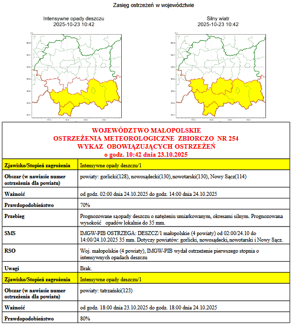 Ostrzeżenie meteorologiczne nr 254 23.10.2025 13:55 Treść Ostrzeżenie meteorologiczne nr 254 Facebook Twitter Email Drukuj