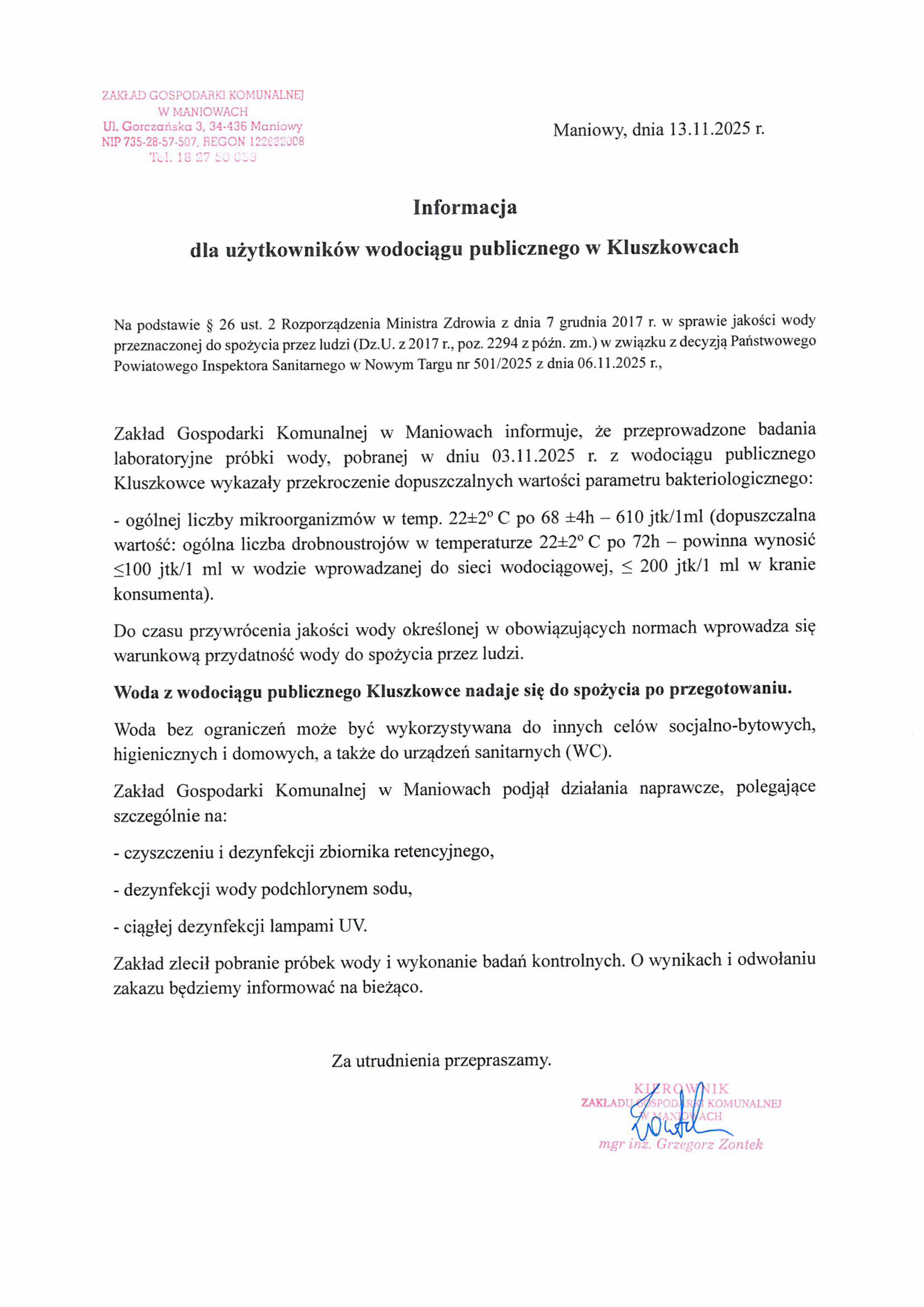 Informacja dla użytkowników wodociągu publicznego w Kluszkowcach