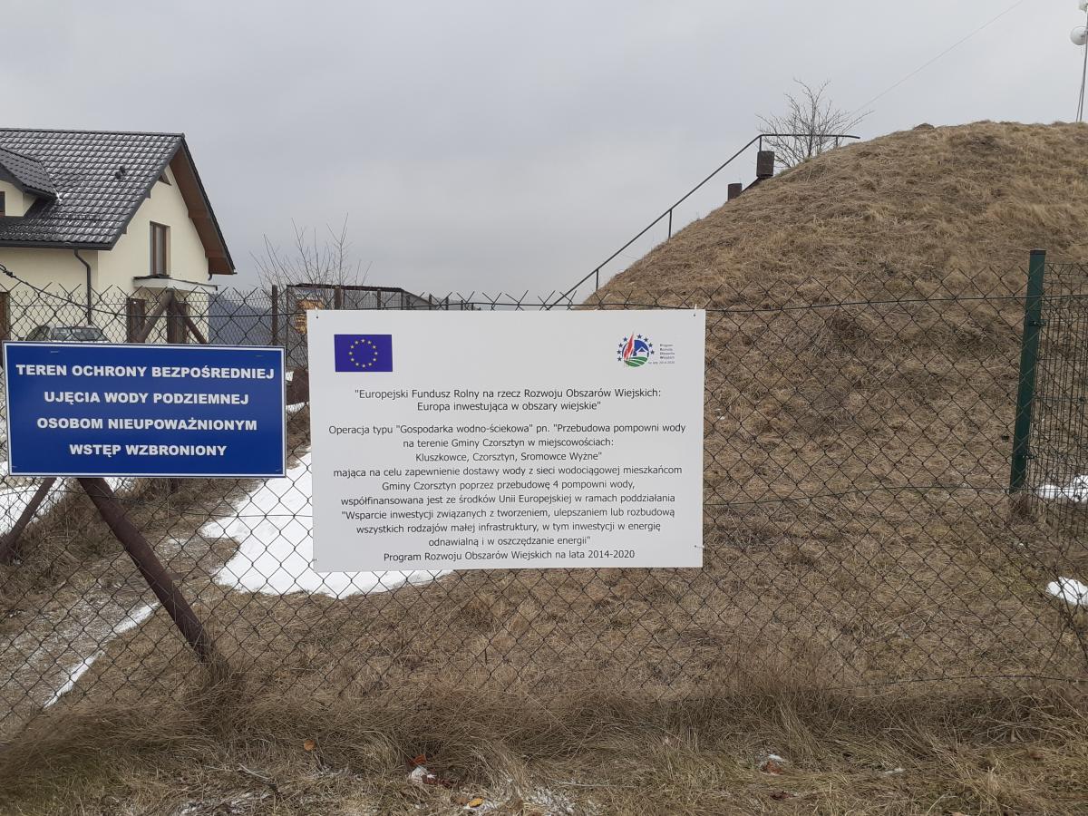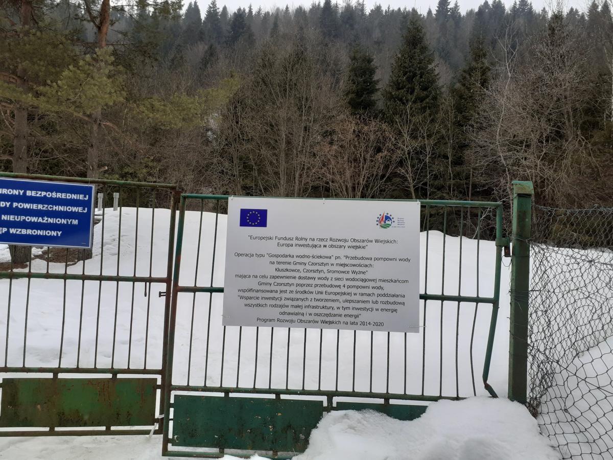 Operacja typu „Gospodarka wodno – ściekowa” pn. „Przebudowa pompowni wody na terenie Gminy Czorsztyn w miejscowościach: Kluszkowce, Czorsztyn, Sromowce Wyżne”, mająca na celu zapewnienie dostawy wody z sieci wodociągowej mieszkańcom miejscowości: Kluszkowce, Czorsztyn, Sromowce Wyżne położonych na terenie Gminy Czorsztyn (2300 osób) poprzez przebudowę 4 pompowni wody, współfinansowana jest ze środków Unii Europejskiej w ramach poddziałania „Wsparcie inwestycji związanych z tworzeniem, ulepszaniem lub rozbudową wszystkich rodzajów małej infrastruktury, w tym inwestycji w energię odnawialną i w oszczędzanie energii” w ramach Programu Rozwoju Obszarów Wiejskich na lata 2014-2020. Przewidywane wyniki operacji: rozwój gospodarczy obszarów wiejskich oraz poprawa warunków życia mieszkańców i turystów.